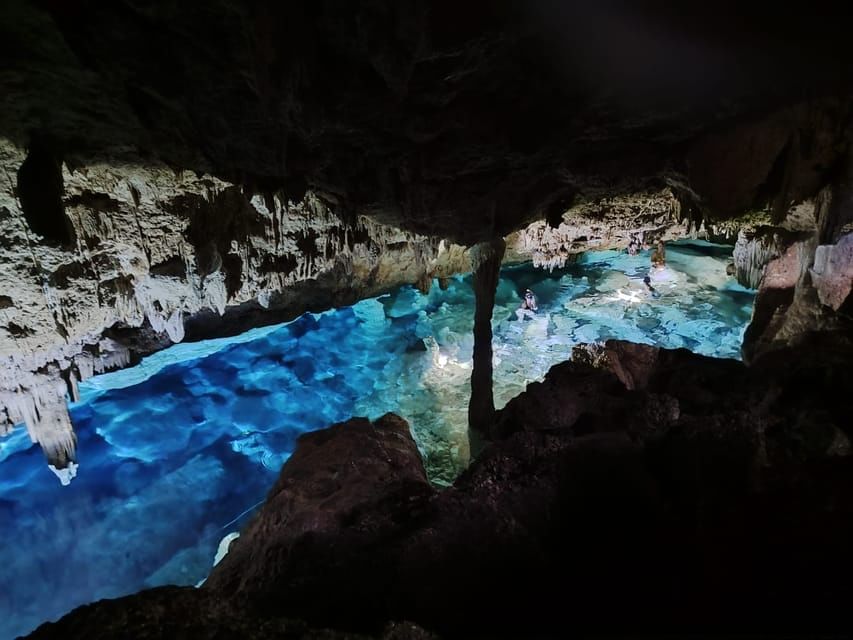 Let yourself be enchanted by the magic of Cenotes Chicho, where light plays on the deep blue water, creating a dazzling spectacle that dances on the walls of these natural wonders. During this guided tour in a small group, you will be accompanied by Gaëlle and Julien, the passionate owners of diving center, who will share their love for this enchanting place with you. Pickup and return to your hotel in Bayahibe are included. Imagine diving into a fairy-tale underwater world, equipped with your snorkeling gear, ready to explore enchanting aquatic landscapes. Pickup is directly from your hotel in Dominicus, and for our friends staying in Bayahibe or at the Hilton hotel, a pleasant ~10-minute walk will lead you to our diving center. Enjoy a moment of serenity during the taxi transfer, letting the excitement of the upcoming adventure wash over you. Your exploration begins with a walk along a marked trail in the Cotubanama National Park, where the vibrant flora and fauna burst with color. Each step brings you closer to the cenotes, true jewels of nature. Illuminate your path with a flashlight and descend into the cave, whose majestic entrance invites you to discover its secrets. At the bottom of the stairs, plunge into crystal-clear water at 25°C, a true elixir of freshness. Safety is our priority, and we pay special attention to our visitors. You can relax and fully enjoy this unique experience, knowing you are in good hands. Admire the enchanting beauty of this place, where stalactites, stalagmites, and columns rise like natural sculptures, witnesses of a bygone era. Don’t forget to gaze beneath the waves of this freshwater spring, a sacred sanctuary for the ancient inhabitants of Hispaniola, where every drop tells a story. After this revitalizing experience, walk back through the jungle with a light heart and an amazed spirit. Before returning to your accommodation in Bayahibe, savor a snack, a moment of sharing and conviviality with Gaëlle and Julien, to conclude this magical day.