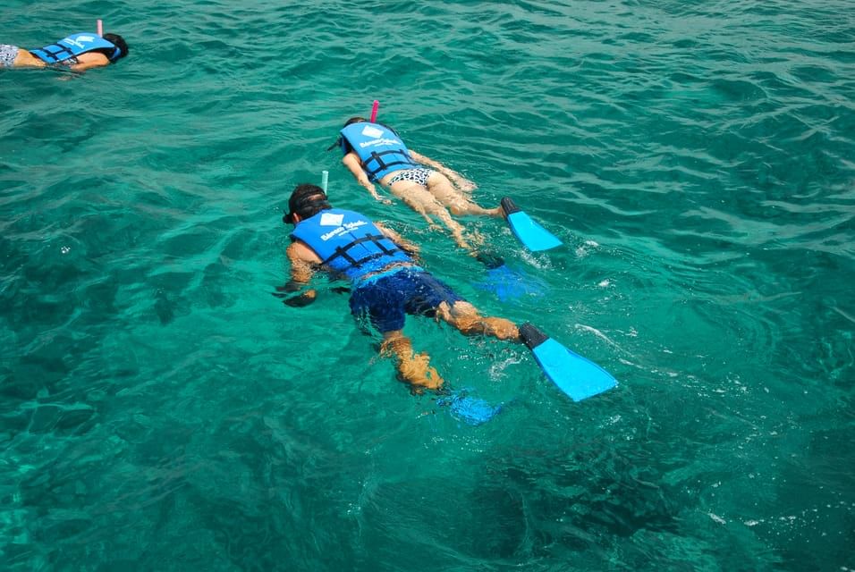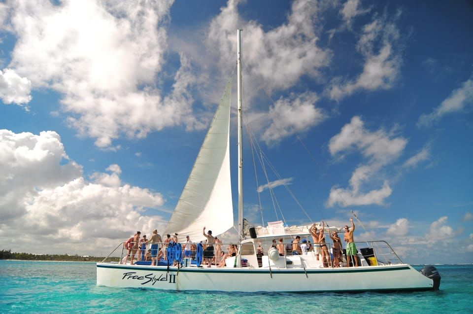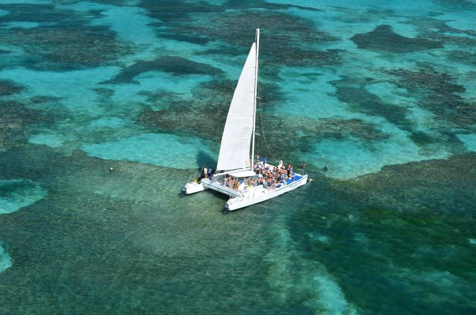 Embark on a splendid catamaran and receive a refreshing welcome drink. The catamaran will sail along the Bavaro coast, stopping at an untouched natural reef. Here, guests can partake in an awe-inspiring snorkeling adventure, exploring vibrant marine life and exquisite coral formations in crystal-clear waters. Once back on board, the bar will be open for everyone to enjoy. After a brief journey, the catamaran will anchor at a mesmerizing natural pool. In this shallow sandbank, guests can enjoy entertaining activities, savor their beverages from our floating bar while relishing the magnificent surroundings, or dance to the onboard music.
