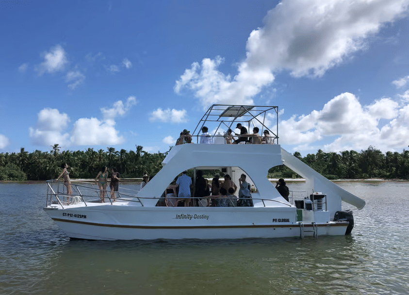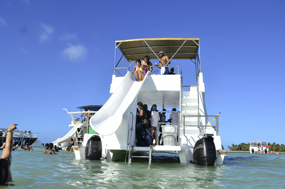 Discover the beauty of the Bavaro coast on an excellent catamaran excursion. The first activity you can enjoy is snorkeling, where you can see a wide variety of tropical fish. When you return to the ship you will find the bar open to everyone and you will be able to appreciate the flavor of our drinks (Barceló Rum, Presidente Beer, a variety of natural juices, Coca Cola, Sprite, water and the typical mamajuana), accompanied by a snack (nachos Mexican sauce and sweet cookies) all properly sealed. We will continue our tour towards the paradisiacal natural pool where you can relax, listen to good music, participating in our entertainment activities that will continue until we return to our meeting point.